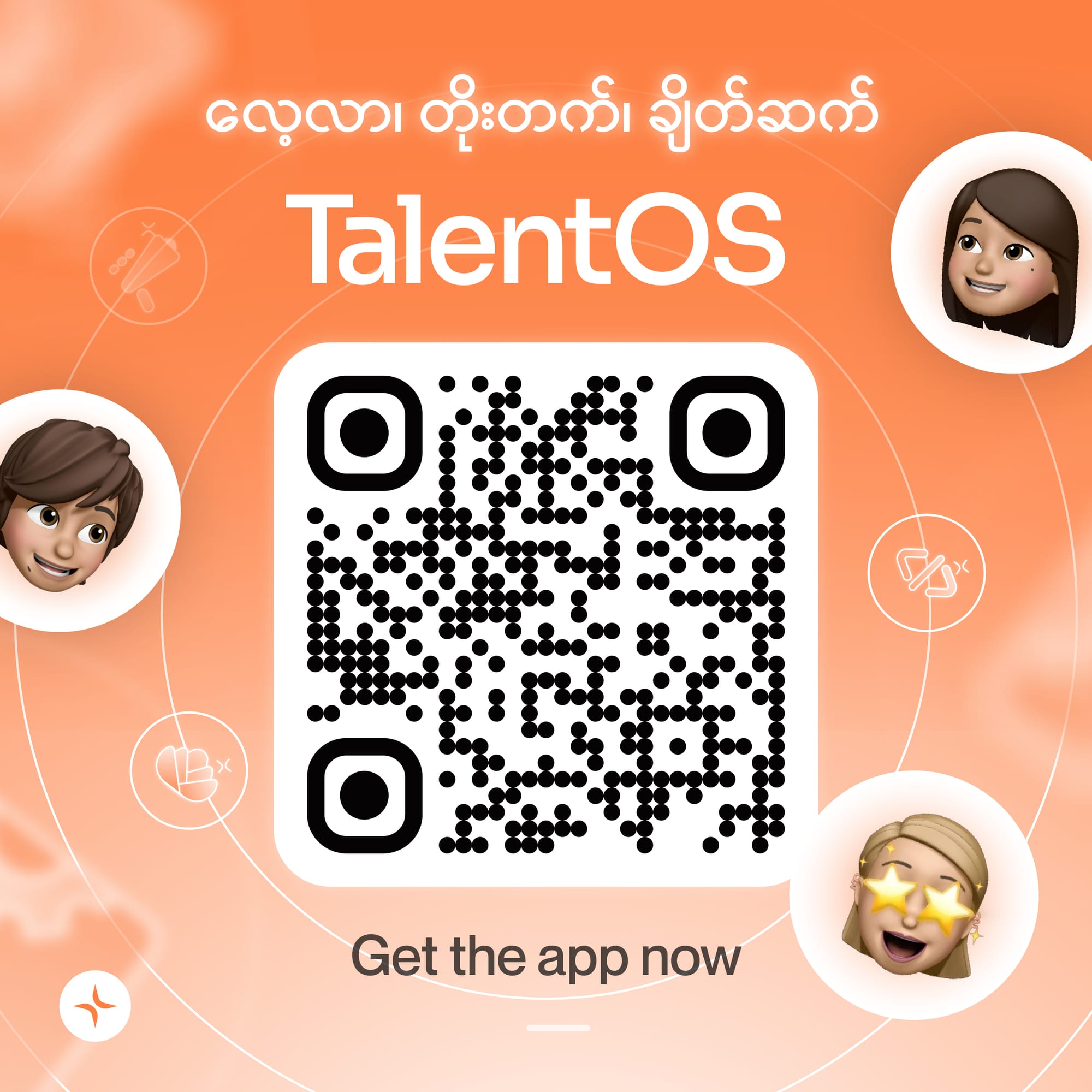 TalentOS နဲ့အတူ ကိုယ့်ရဲ့လုပ်နိုင်စွမ်းတွေကို ဖော်ထုတ်ဖို့ အခုပဲ Play Store/ App Store မှာ Download ရယူလိုက်ပါ။